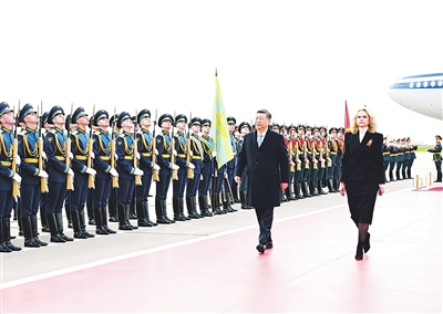 俄方在机场举行隆重迎接仪式。军乐团奏中俄两国国歌。习近平检阅仪仗队并观看分列式。
