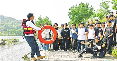 5月7日,浙江省台州市仙居县红十字会志愿者为官路镇初中生培训防溺水急救知识。