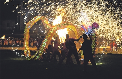 夜幕降临,在庄重的传统祭祀仪式结束后,一条33米长的“天空飞龙”携火腾空,在夜空中蜿蜒盘旋,气势磅礴,引发现场观众的阵阵惊叹,国家级非物质文化遗产“打铁花”惊艳亮相,1600℃高温铁水在夜空中迸射,化作漫天璀璨星雨,与气势恢宏的传统舞龙表演交相辉映,舞龙者在火环与风火轮中穿梭腾挪,展现力与美的融合。