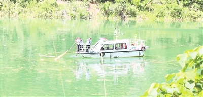 在蒙江大桥下游河段执法现场,执法人员乘执法船沿着河流仔细巡查,对岸边草丛中隐藏的地笼网、抬网等进行逐一排查。一经发现,执法人员就将这些禁用渔具拆解、搬运至执法船上。