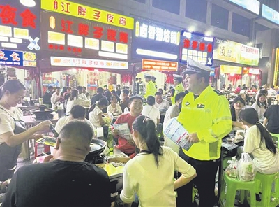 活动中,民警在夜宵店的餐桌、吧台、墙面等醒目位置张贴“拒绝酒驾”宣传海报,向就餐群众发放宣传资料,并结合典型案例面对面讲解酒驾危害及法律成本,提醒群众牢记“开车不喝酒,喝酒不开车”,自觉遵守交通法规,主动劝阻酒后驾驶行为。