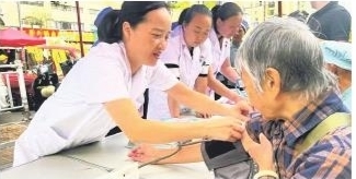 图为医务人员为群众测血压。