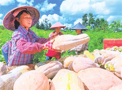 “我们特意将土地集中连片,方便机械化作业。”正在操作山地拖拉机的村民宋祖元介绍,“传统方式运南瓜费时费力,现在通过前期整合地块、后期机械协助,4名工人不到10分钟就能收完300多公斤南瓜,一小时运送近两吨,日运输量可达10吨左右。”这种现代化的作业方式不仅减轻了劳动强度,也显著提高了采收效率。