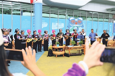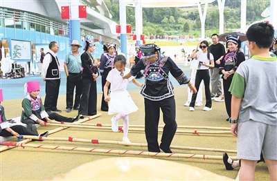 在中国天眼景区天幕街,悠扬的布依八音弹唱与竹竿开合的清脆声交织在一起,身着民族服饰的非物质文化遗产代表性传承人正带领游客沉浸式体验非遗魅力。