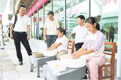 在牙舟陶制作体验区,在专业老师的指导下,孩子们充分发挥想象力,拉坯、塑形……不一会儿,泥团在手中变成各式各样的杯子、花瓶等陶器。