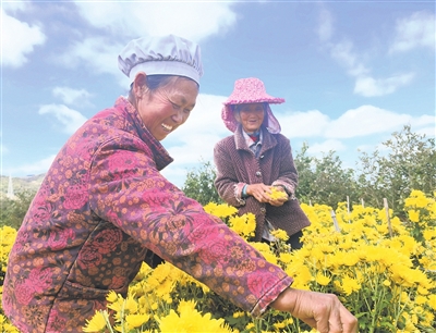 村民在采摘菊花