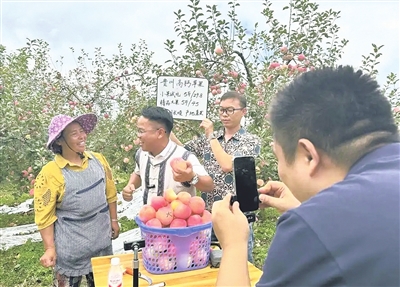 “小熊村长”(左二)义务助农直播卖苹果