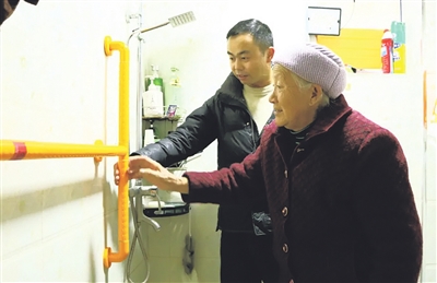 “婆,最近身体怎么样呀?这些新添的设施用着还顺手不?”走进井城街道两户特殊困难老人家中,床边的起身扶手、墙体上的安全扶手、浴室里的沐浴椅、地面的防滑垫等配备齐全,轮椅、拐杖等辅助器具也放置在旁。