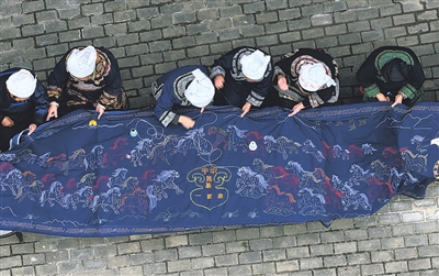 在中和镇雪花湖社区非遗一条街,绣娘们聚精会神,共同完成这份特殊的新春贺礼。长卷上,56匹骏马姿态各异,奔腾跃动,环绕着一个古朴的水书“吉”字,寓意深远。