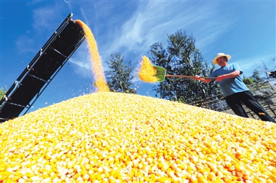9月22日,河北省遵化市东新庄镇农民在场院晾晒玉米。