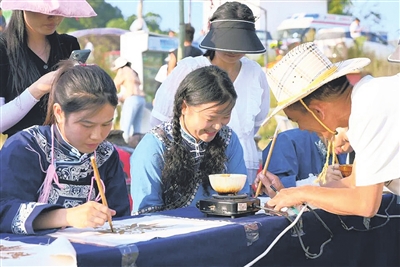 枫香印染技艺是国家级非物质文化遗产项目,被誉为“画布上的青花瓷”,是布依族“不需出土的文物”,承载着布依族人民数百年的智慧和情感,体现了布依族的民族文化内涵。惠水布依儿女用独特的枫香染画作把秋天的味道、丰收的喜悦画在画里,让传统非遗在丰收的季节里展现非凡魅力。