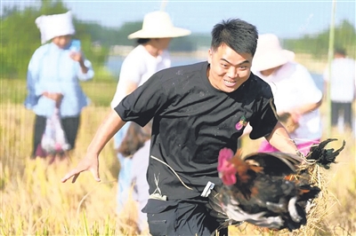 在稻田捉鸡环节,选手们以迅雷不及掩耳之势,扑向圈在栅栏里的土鸡。顿时,鸡飞人追、你争我抢,场面趣味横生。