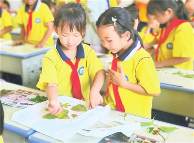 随后,在科普讲解员的带领下,同学们踏上了“寻宝”之旅,他们穿梭在绿意盎然的草坪、繁花似锦的花坛和静谧的林间小路,只为找到那些独特而美丽的植物拓染“原材料”,大家纷纷拿出工具和材料,跟随科普讲解员的步骤,全神贯注地涂水彩笔、按压叶片,用独特的想象力呈现出不同的图案,大家也在其中认识了多种植物,获得了奇妙的动手体验,感受到了植物拓染的趣味性。