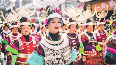 11月10日,身着盛装的苗族同胞参加巡游活动。