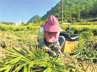 刚挖出的生姜色泽金黄、饱满圆润。“今天是我到这务工的第4天,早上送完孩子上学,就跟其他村民们一起过来了,每天可以收入100多元。”村民李阿姨正快速切掉姜叶,将金黄的生姜放进箱子。