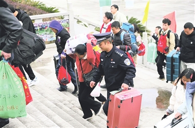 图为民警护送务工人员乘车返岗。