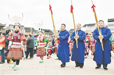 2月15日,在贵州省凯里市舟溪镇“甘囊香”芦笙堂,苗族群众在吹奏芦笙。