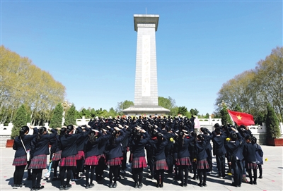 4月1日,在位于石家庄市的华北军区烈士陵园,学生在烈士纪念碑前敬礼。