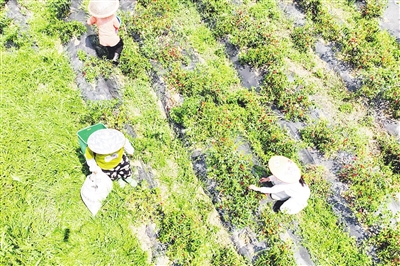 “家里的土地流转给合作社,自己不用操心耕种,每天来基地务工,既能照顾家里,又能多赚份收入。”务工村民杨荣芬说,“我们来采摘是按斤计价,摘到多少算多少。”