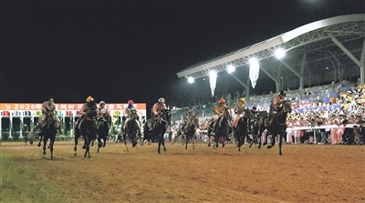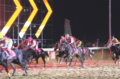 当晚7点半,西部赛马城内灯火璀璨。赛道上,随着裁判发令枪响,十余匹骏马如离弦之箭冲出起点,赛马肌肉绷紧,铁蹄声雷动,看台上游客纷纷举起手机记录精彩瞬间。在最后冲刺阶段,骑手们你追我赶,时而并驾齐驱,时而一马当先,骑手们近乎伏于马背,扯紧缰绳,策马奔驰,激烈的角逐获得了全场欢呼声。