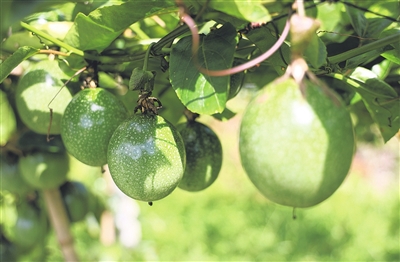 走进基地,馥郁的果香扑鼻而来。放眼望去,绿油油的藤蔓间挂满浑圆饱满、色泽鲜亮的百香果,工人们正穿梭其间熟练地采摘果实,脸上洋溢着丰收的喜悦。工人江正学一边采摘一边说:“现在摘的都是主枝上的大果,七八个就有1公斤,每人每天可以摘100到150公斤。”