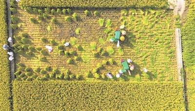 图为工人正按农技专家要求收割稻谷。