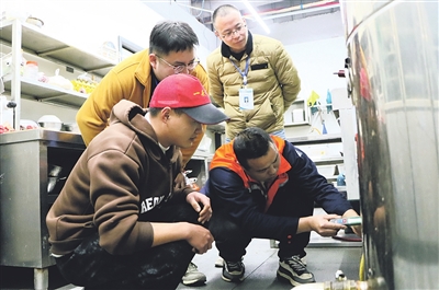 图为执法人员细致检查燃气设施
